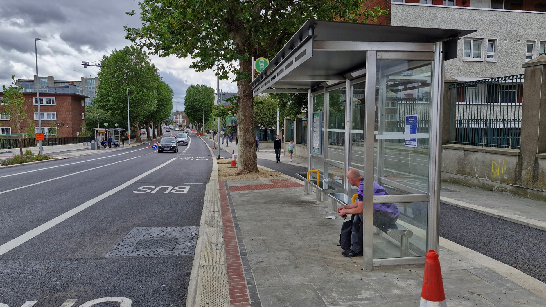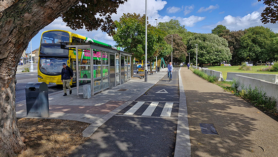 These features include: the introduction of continuous footpaths at junctions, fully segregated cycle tracks with island bus stops; maximum use of SuDS and of bioretention areas; vacuum excavation to maintain existing mature trees, and conservation of historic fabric along the route.