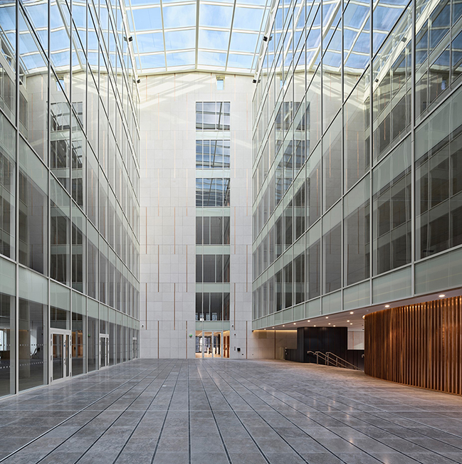 In engineering terms, the double-basement construction close to active Luas lines required imagination, assurance and close co-operation with TII. The narrow but impressive atrium has an impressive cantilever at its base, enlarging its footprint at ground level and it is capped by a deceptively simple glass roof.