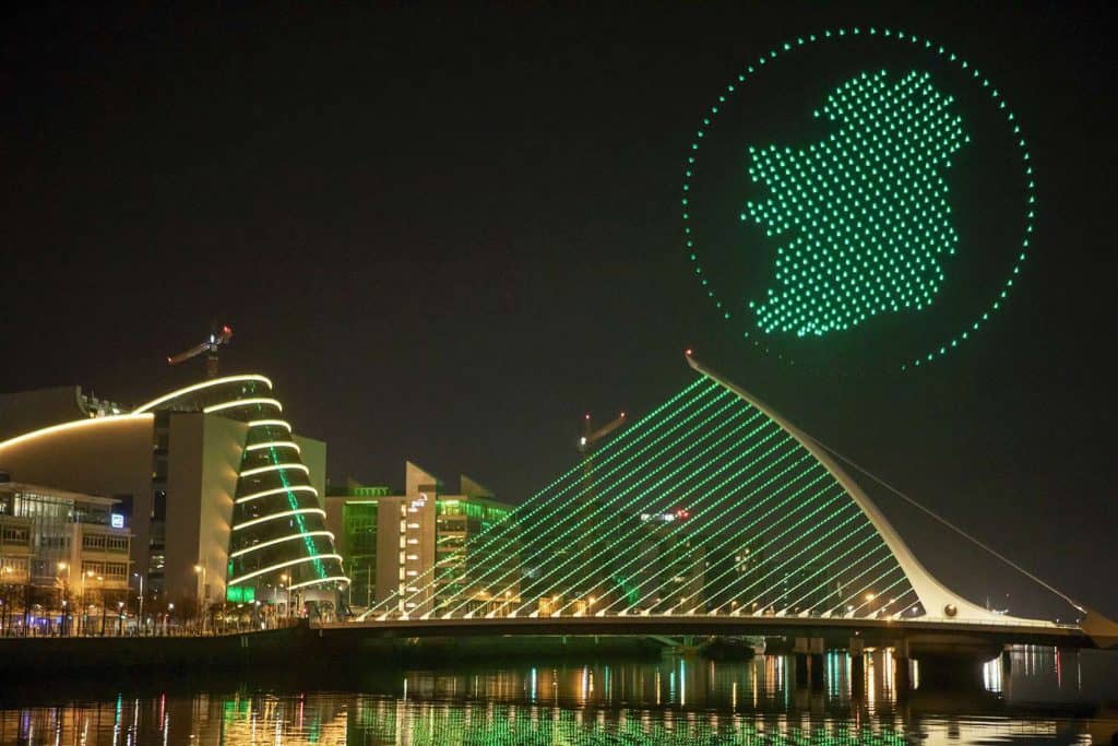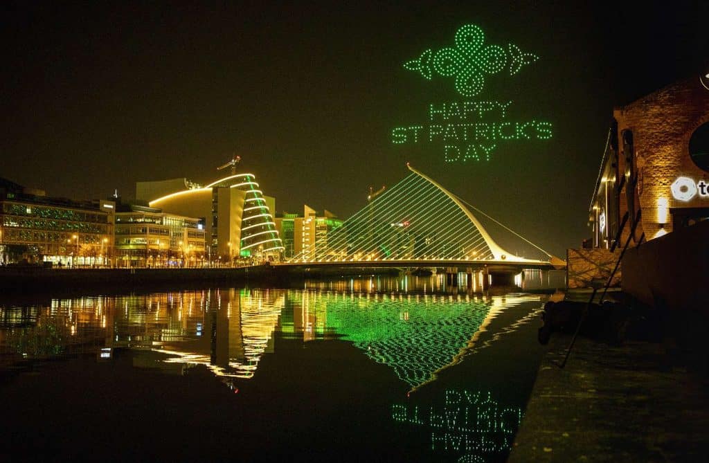 In this cutting-edge display, drones blur the boundaries between technology and art as they light up the sky above Ireland’s capital city, illuminating some of Dublin’s most well-known landmarks such as the Samuel Beckett Bridge and the Convention Centre Dublin. A series of animations designed by St. Patrick’s Festival and Aiden Grennelle tell a powerful story of love, hope and home, while celtic knots, musical instruments and Irish dance represent the world-wide reach and love of Irish culture, celebrated by millions each year on the 17th of March.