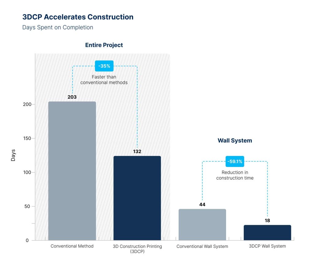 The use of the 3DCP technology meant 35% faster construction and completion in just 132 days compared to conventional methods requiring more than 200 days, with the 3D printed superstructure completed in just 12 printing days.