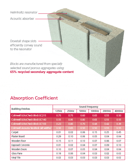 The Colinwell EchoCheck Acoustic Block allows design teams to address sound control issues and to provide a low maintenance Fair-Face finish in one product. The rate of sound energy absorbed by any surface, known as the absorption coefficient, will have a factor between 1 and 0, with 1 being complete sound absorption and 0 being full reflection. The table shows the Absorption Coefficient of commonly used construction materials and finishes.