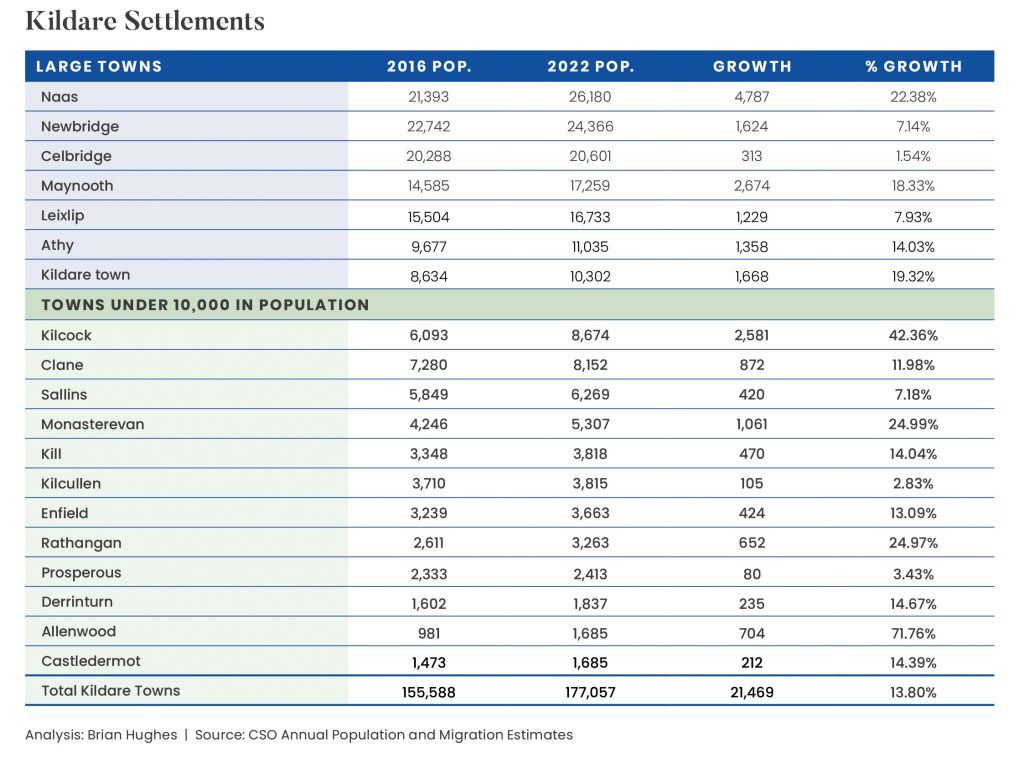 Kildare’s list of towns of below 10,000 people, again in descending order of population include Kilcock, Clane, Sallins, Monasterevin, Kill, Kilcullen, Enfield, Rathangan, Prosperous, Derrinturn, Allenwood and Castledermot. Towns with small or no growth usually have significant infrastructure issues.