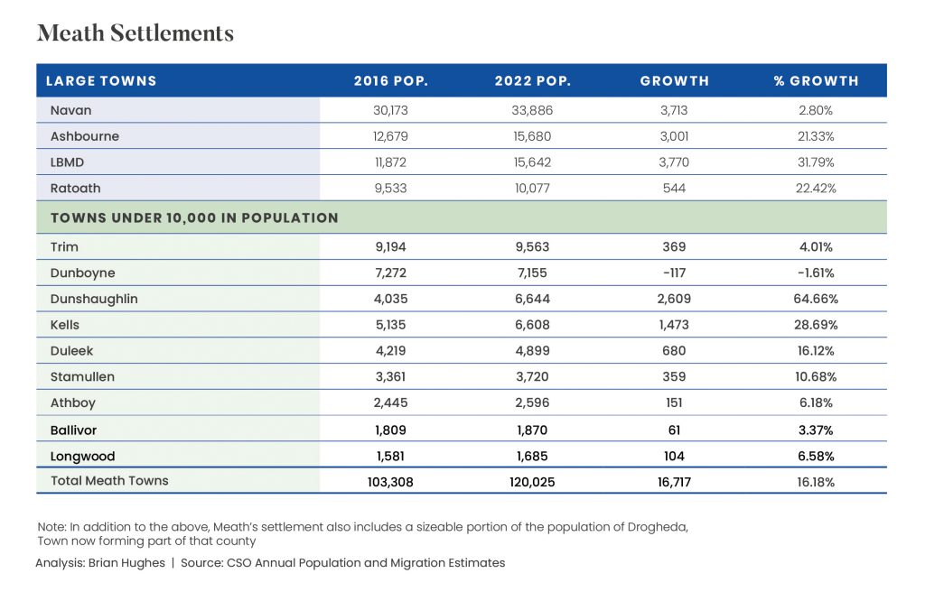 Meath is Leinster’s second largest county in surface area. In the 2016-2022 period Meath was the State’s fastest growing county, with the population increasing by 13.22% to reach 220,826. This growth is reflected in its listed Towns’ overall growth of 16.18% during intercensal 2016-2022. In contrast with Kildare, Meath is still very rural with a 42.93% rural share of its total population. Its urban population comprises: