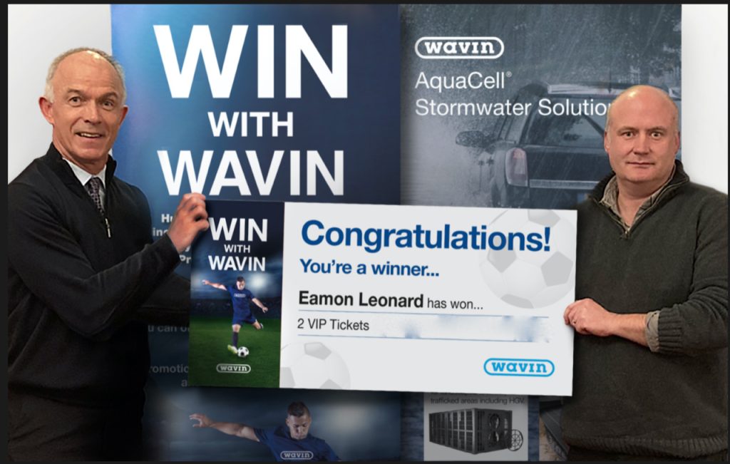 Eamon is pictured (right) receiving his tickets at Dublin Providers Ltd from John Finn, Sales Executive at Wavin Ireland.