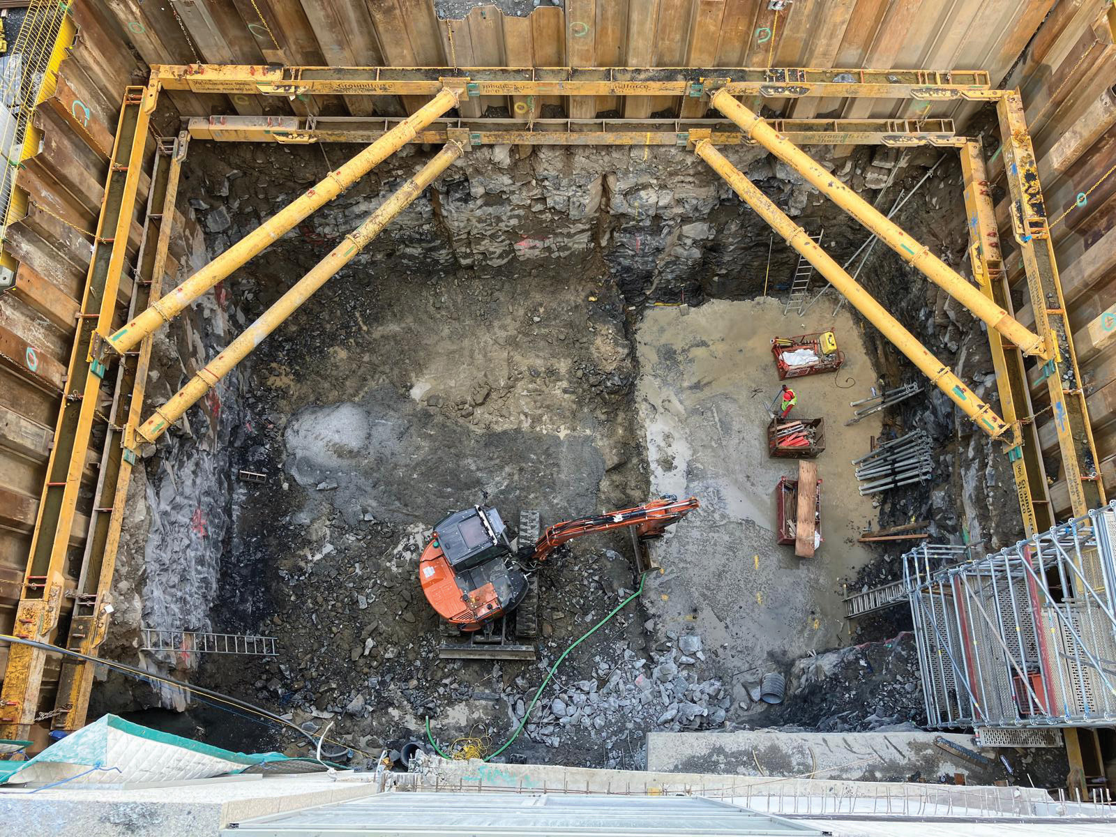 However, the size of this excavation (measuring approximately 14m x 17.5m) and its location against the wall of an existing building required a different approach.