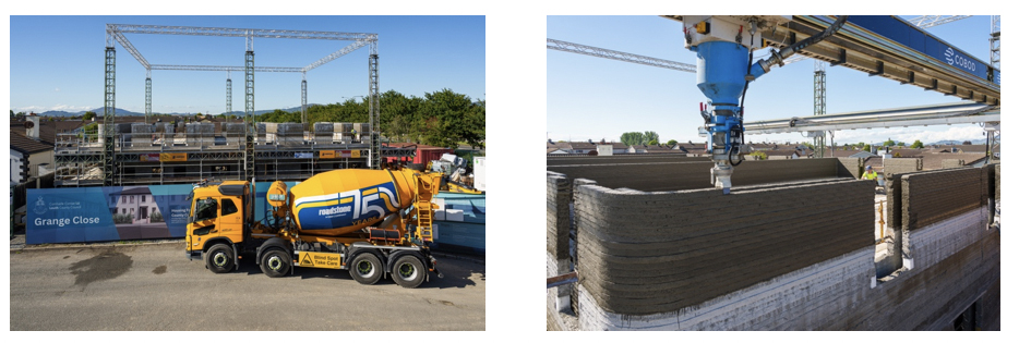 The first residential housing development constructed using 3D Construction Technology (3DCP) has been completed in Dundalk, Co. Louth. Three two-storey, three-bedroom terraced units, each with a gross internal area of 110 m², have been delivered for Louth County Council. An official event was held in Dundalk on February 6th to formally hand the homes over to three local families previously on the Louth local authority housing list.