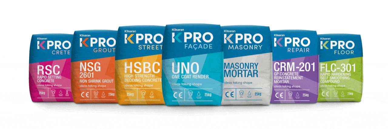 KPRO is the overarching brand that sits across Kilsarans seven families of dry mortar products which include Masonry, Facade, Street, Floor, Crete, Grout and Repair each with their own distinctive colour way. Along with the new branding and packaging there will also be some new additions to the Dry Mortar product suite, providing the industry with a vast range of product solutions from a name they can trust.