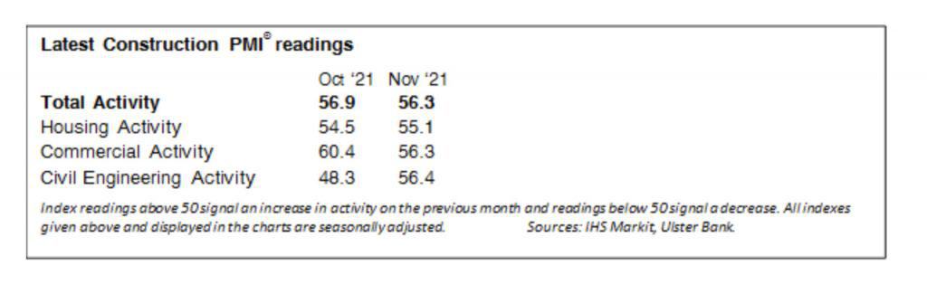 “The recent Quarterly National Accounts from the Central Statistics Office indicated that construction was one of the fastest-growing sectors of the Irish economy in the third quarter of this year. The latest results of the Ulster Bank Construction PMI survey highlight that construction firms have continued to experience strong growth through the middle of the fourth quarter. The headline PMI eased slightly in November, but at 56.3 remains at elevated levels consistent with a strong pace of activity expansion, albeit one which has decelerated from the exceptional, post-lockdown snap-back growth registered earlier in the year. The pace of growth moderated somewhat from a very rapid pace in Commercial activity, while Housing and Civil Engineering both registered improvement last month to leave all three sub-sectors in expansion territory.