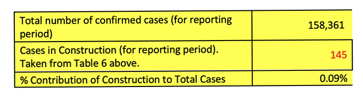 Of the 158,361 confirmed cases (since January), 145 cases (0.09% of total) were attributed to construction: