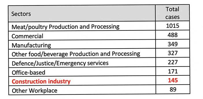 Of the specified workplaces outlined in the HSPC report, construction has the lowest number of C-19 cases versus other sectors (145) since January: