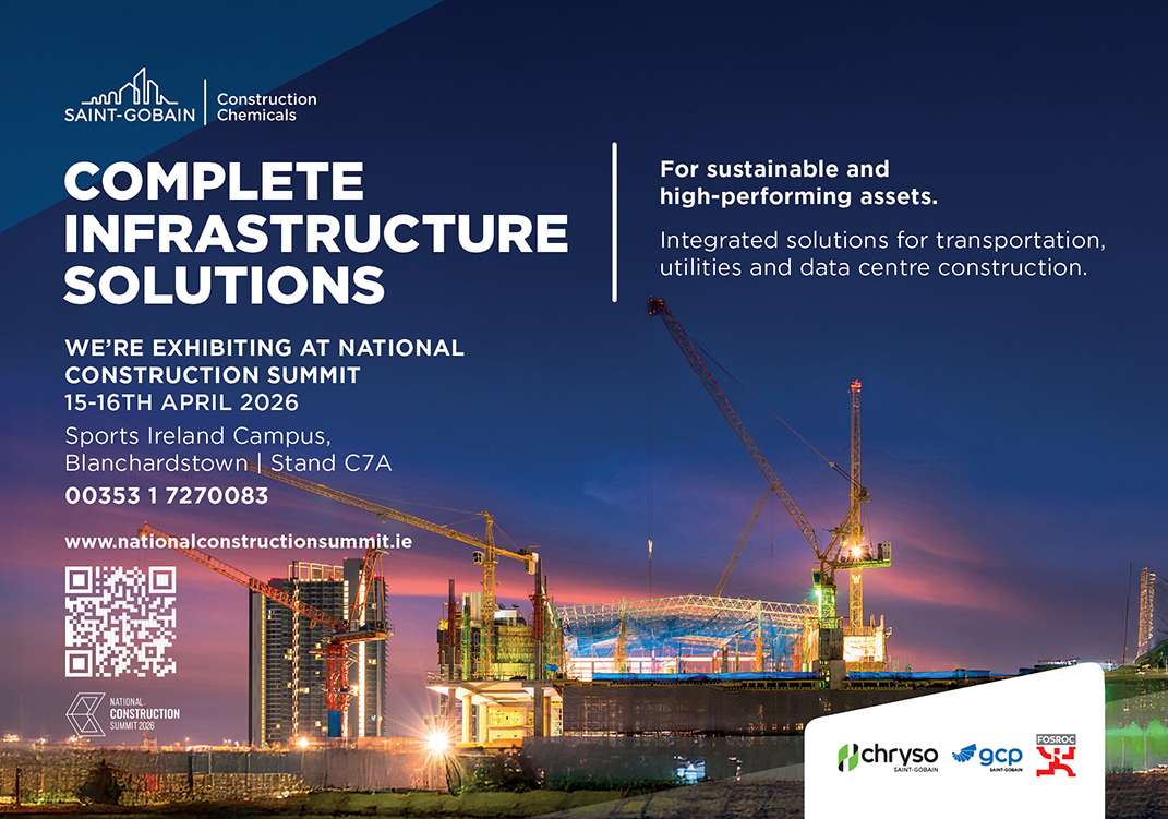 Saint‑Gobain Construction Chemicals (SGCC) will participate in the National Construction Summit in Dublin on 15–16 April, welcoming visitors to Stand C7A. SGCC will spotlight its integrated Data Centre Solutions, designed to deliver higher efficiency, lower embodied carbon, and enhanced resilience for Ireland’s rapidly expanding digital infrastructure sector.