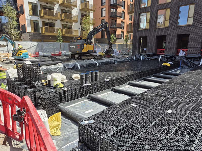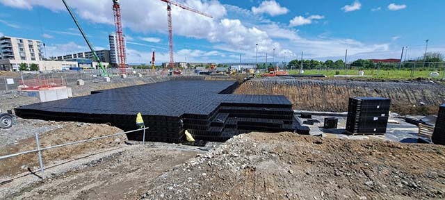 Due to increased activity in the building sector over the last decade or so, local authorities have laid down strict guidelines for developers who wish to construct new projects on existing non-developed land. No longer can collected stormwater be discharged openly into the existing drainage network. All developments of scale now have to contain their stormwater on site and slowly release it to the drainage network at a controlled rate. To facilitate this, Geoline Ltd has partnered up with a number of UK and German manufacturers using GeoBloc, Pluvial Cube and Polystorm Attenuation Crate Systems to install underground stormwater storage tanks. Underground tanks are particularly of interest on development sites where space is limited and wherever m2 of land is valuable.