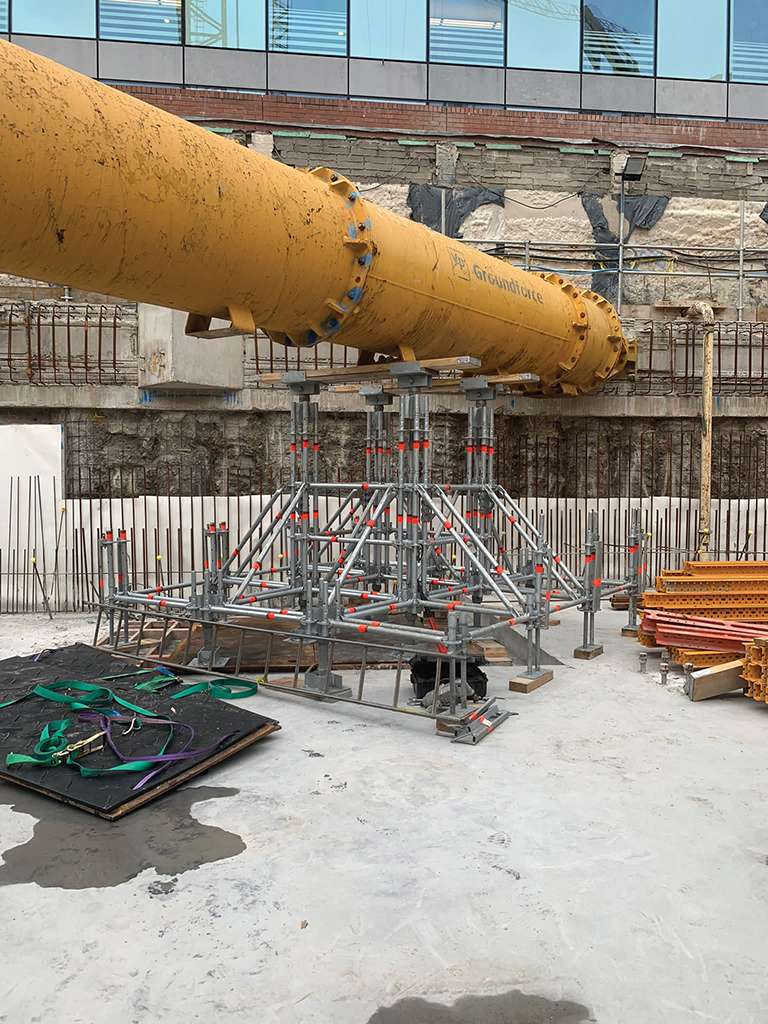 In this application for Sisk subcontractor Larkmount Developments at Wilton Place, three loading towers assembled off site were supplied. Each tower was designed to accept a load of 60 kN. The Temporary Works Design was finalised after initial discussions on site with Sisk and Larkmount where the loadings and sequence for removal were considered. The basement dig on the site had been supported by large flying horizontal shoring “Super Tubes”. These tubes had been put in place using a crawler crane earlier in the program and their removal required they be broken into smaller sections for safe lifting and removal off site by the tower cranes. The loading towers were put in place with a steel plate used to distribute the load into the four columns of the tower. The High Capacities are achieved by joining vertical standards into clusters of four with heavy duty base and head jacks for load transfer from above and below. System components provide bracing and a wide footprint provided inherent stability.